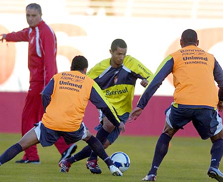 A primeira semana 'cheia' de trabalhos de Tite à frente do comando técnico do Inter está movimentando o grupo colorado. A fria tarde desta terça-feira contrastou com a alta intensidade da atividade comandada pelo treinador. Em um primeiro momento, Tite exercitou as finalizações em gol. As bolas eram cruzadas pelos laterais para área, onde meio-campistas e atacantes tentavam a conclusão. Tite exigia intensidade similar à empregada nos jogos. "Tem que ter poder de decisão, faz de conta que é uma partida", pedia o treinador.