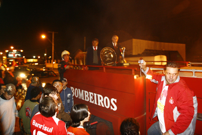 Os colorados da cidade de Mostardas e região, no litoral gaúcho, festejaram na última sexata-feira (27/06) a presença das maiores taças conquistadas pelo Inter em sua história. Os troféus da Libertadores, Mundial, Recopa e, também, da Copa Dubai desfilaram em cima de um caminhão de bombeiros logo na chegada da cidade e fizeram brilhar os olhos de todos que puderam vê-las.