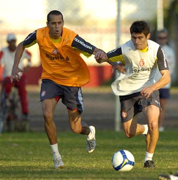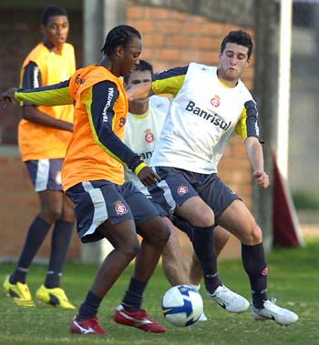Alex (D) foge da marcação de Derley durante treino: Inter vai em busca da terceira vitória consecutiva no Brasileirão