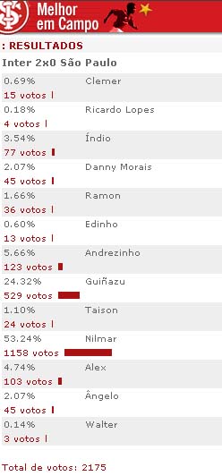 O atacante Nilmar foi escolhido pela torcida colorada como o melhor jogador em campo na vitória de 2 a 0 sobre o São Paulo, em votação realizada no site oficial do clube. O jogador recebeu 1158 votos (53.24%). Participaram da enquete 2175 internautas. Nilmar já havia sido escolhido o melhor em campo nas duas partidas anteriores, contra Náutico e Atlético-MG.