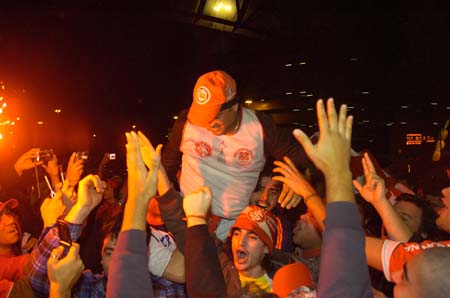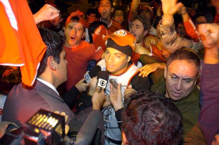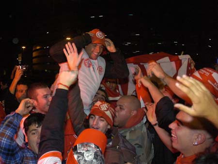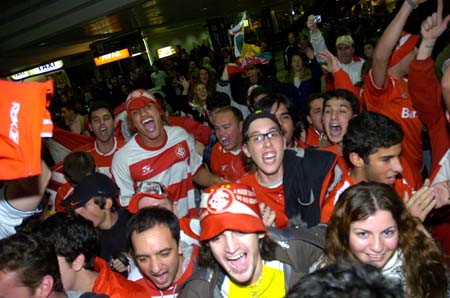 Os torcedores começaram a se aglomerar por volta das 23h e aos poucos tomaram conta do setor de desembarque do Salgado Filho. Durante a espera, cantaram as músicas da Guarda Popular e o Hino do Inter, vaiaram e xingaram torcedores de outros times que passavam por ali e fizeram uma grande celebração, quando Daniel Carvalho apareceu. ?Oooooooo, Daniel voltoooooooooou, Daniel voltooooooooou, Daniel voltooooooooooou?, saudaram.