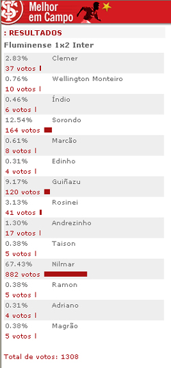 O atacante Nilmar foi escolhido pela torcida colorada como o melhor jogador em campo na vitória de 2 a 1 sobre o Fluminense, em votação realizada no site oficial do clube. O jogador recebeu 882 votos (67.43%). Participaram da enquete 1308 internautas.