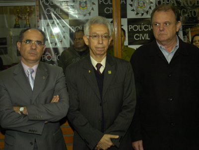 Autoridades estaduais: Chefe da Polícia Civil, Del. Pedro Rodrigues, Secretário de Segurança, Edson Goulart, e presidente do Inter, Vitorio Piffero