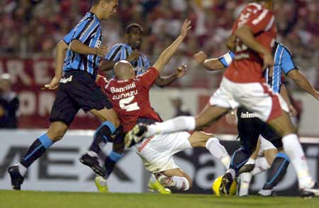 A torcida colorada já se acostumou com o seguinte momento nas partidas. De repente, um jogador adversário domina a bola no meio-campo. Sente-se confiante e tenta sair para o ataque. No instante seguinte, feito um bólido, surge o argentino Guiñazu, em grande velocidade e lhe toma a bola. No Gre-Nal desta quarta-feira, foram inúmeros lances como este. Mais uma vez o volante foi sinônimo de raça, disposição e combate no time colorado.