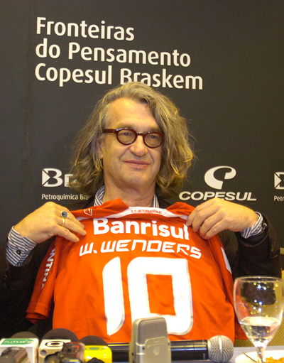 O cineasta alemão Wim Wenders recebeu uma camisa oficial do Internacional personalizada com seu nome na tarde desta segunda-feira. Wenders visitou Porto Alegre para palestrar dentro do evento Fronteiras do Pensamento, que reúne alguns dos principais nomes da cultura do mundo. O autor de obras como Asas do Desejo, O Estado das Coisas, Buena Vista Social Club, entre tantos outros, é fã de futebol e torce pelo Fortuna Dusseldorf, que tem as mesmas cores do Inter: o vermelho e o branco. Wenders agradeceu o presente do Campeão do Mundo FIFA e gostou também do número 10 que tinha nas costas da camisa. ?10 é um bom número?, disse Wenders, ao receber a camisa, depois da entrevista coletiva que concedeu no Hotel Sheraton.