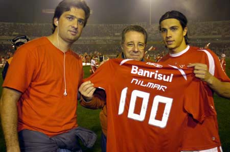 Nilmar recebeu uma camisa alusiva ao seu 100º jogo pelo Inter das mãos do vice-presidente de marketing Jorge Avancini (C) e do diretor João Machado