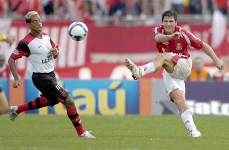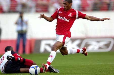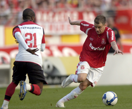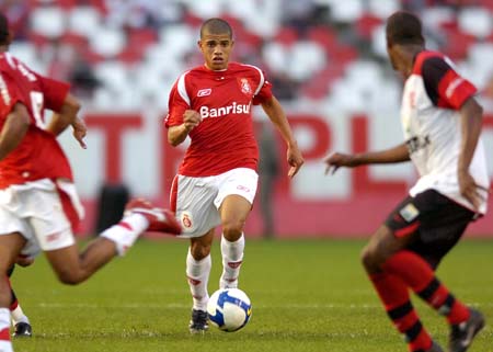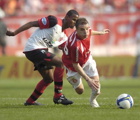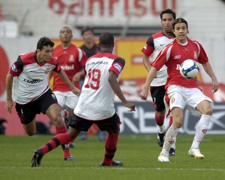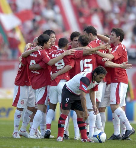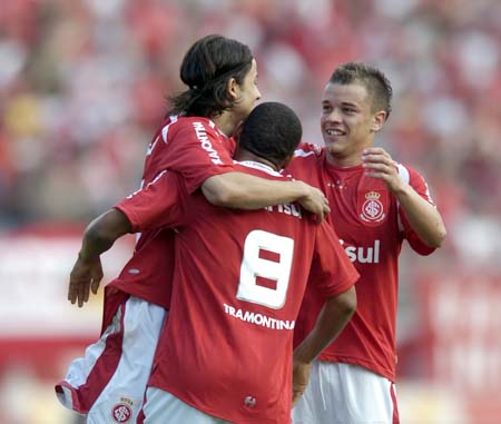 Nilmar (D) comemora com Rosinei (C) e D'Alessandro o gol contra o Flamengo