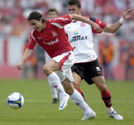 O Inter seguia envolvente na troca de passes rápidos, dificultando o trabalho de marcação do Flamengo. Destaque para a movimentação de Alex e Nilmar, na frente.