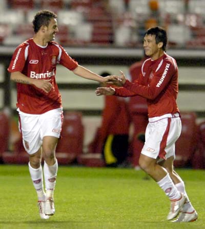 Magrão (E) e Índio comemoram o gol da vitória