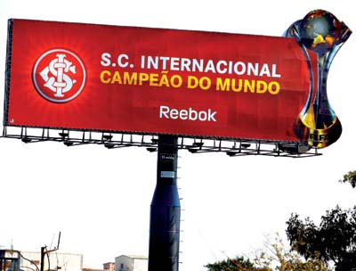 Uma das ações que movimentaram a área de marketing do Sport Club Internacional no último mês de agosto foi a instalação do frontlight com a maior conquista da história do Clube. A peça em dupla face foi instalada em um ponto nobre da Freeway, próximo à rótula da BR 116 que dá acesso a Canoas. O frontlight ostenta o título de Campeão Mundial FIFA exibindo a imagem da taça da competição. A Reebok, fornecedora de material esportivo do Inter é apoiadora desta ação e assina junto à peça.