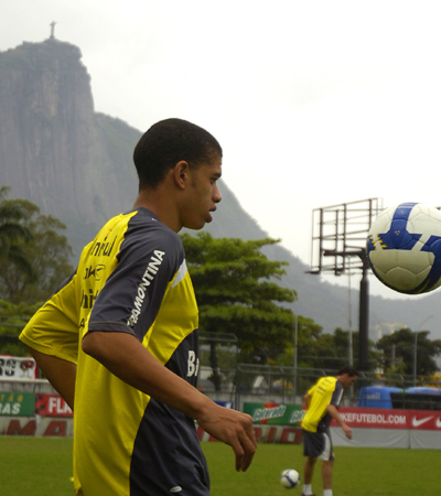 Com o Corcovado ao fundo, Taison treina com a equipe na Gávea