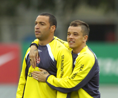 Nilmar (de costas) cabeceia pra marcar o gol em treino na capital carioca