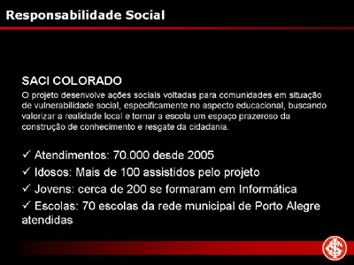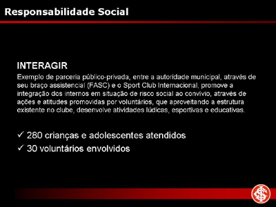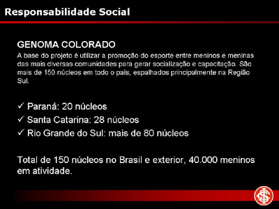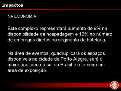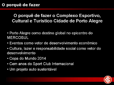 Na ocasião, além da apresentação de slides descrevendo como será o Gigante Para Sempre, bem como suas melhorias no complexo colorado que será cada vez mais parte do eixo turístico da cidade, Piffero destacou a preocupação do Inter em trazer benefícios para a comunidade nas áreas sociais e ambientais. O clube já desenvolve diversos projetos que levam vantagens para milhares de gaúchos, de crianças até idosos, e também firmou parceria recentemente para a captura de carbono.