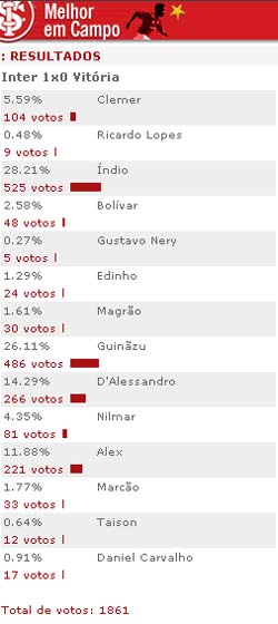 O sócio Antônio Alves de Anhaia, com número de matrícula 74411004, foi o contemplado do jogo contra o Vitória na promoção 'Sorteio da camisa do Melhor em Campo'. Antônio foi sorteado aleatoriamente dentre todos os sócios que ingressaram no estádio para assistirem ao jogo. Anhaia receberá a camisa do zagueiro Índio, eleito o melhor jogador colorado em enquete feita pelo site (veja resultado abaixo). A entrega da camisa será realizada no gramado, no próximo jogo no Beira-Rio.