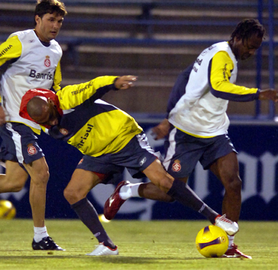Guiñazu (C) treina com sua tradicional capa de chuva por baixo da camisa