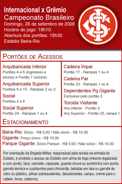 O Internacional informa que estão esgotados os ingressos para o Gre-Nal deste domingo, Beira-Rio. Todos os bilhetes para os diferentes setores do estádio (arquibancada inferior, superior e cadeiras) foram comercializados. São aguardados mais de 40 mil colorados para o clássico Gre-Nal nº 373, válido pela 27ª rodada do Campeonato Brasileiro 2008. Foram colocados à venda 11 mil entradas para não-sócios, os demais lugares serão ocupados pela torcida adversária e pelos milhares de sócios colorados.