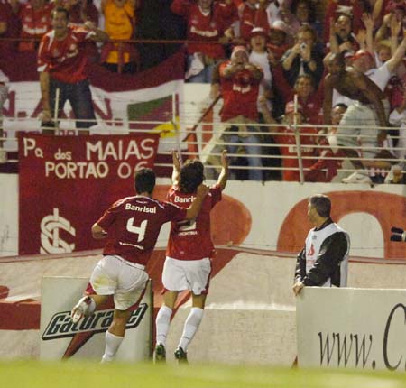 Nilmar (D) e Índio comemoram o quarto gol junto à torcida