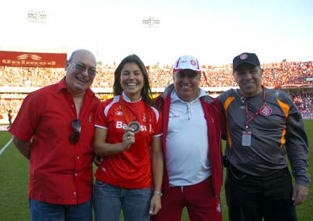 A medalhista olímpica Fernanda Oliveira foi homenageada pelo Sport Club Internacional no gramado do Estádio Beira-Rio, momentos antes do clássico com Grêmio, pelo Campeonato Brasileiro. Medalha de bronze na classe 470 da vela, em Pequim, Fernanda recebeu uma camisa personalizada do vice-presidente de marketing Jorge Avancini.