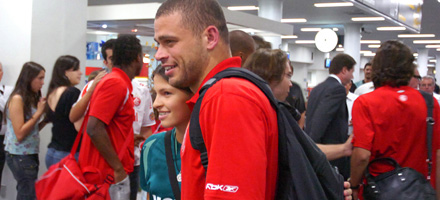 Depois de uma viagem que durou cinco horas e meia com escala em São Paulo, o Internacional chegou a Goiânia por volta das 20h desta quinta-feira a Goiânia, local da partida diante do Goiás, no próximo sábado, válida pela 29º rodada do Brasileirão. Na chegada, cerca de 30 colorados estavam esperando o grupo para as tradicionais fotos e pedidos de autógrafos. Cantaram as músicas de incentivo comuns no Beira-Rio e puderam ver mais de perto os ídolos, que atenderam a todos posando para as fotos e assinando as agendas e livros dos fãs.