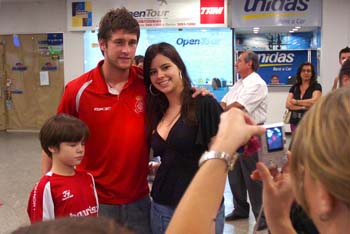 Edinho posa para foto com a torcedora na chegada à capital goiana