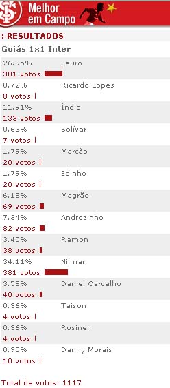 A enquete 'Melhor em campo' da partida Goiás 1x1 Inter foi marcada por uma acirrada disputa entre Nilmar e Lauro. O artilheiro do Inter no Brasileirão com 13 gols foi o vencedor, com 381 votos (34.11%). Mas o goleiro Lauro, que fez sua estréia com a camisa colorada, recebeu 301 votos (26.95%), demonstrando o equilíbrio da votação. Veja os resultados: