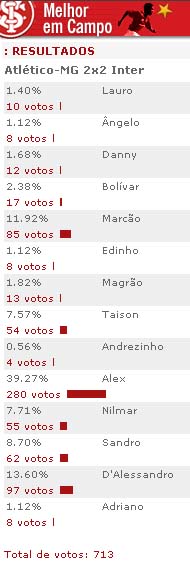 O meia-atacante Alex foi escolhido o melhor jogador em campo do Inter no empate em 2 a 2 com o Atlético-MG. Esta foi a terceira partida consecutiva que o artilheiro colorado ganhou a enquete realizada no site. Contra Atlético-PR e Boca Juniors, ele já havia sido o mais votado. Autor do primeiro gol do Inter no Mineirão, Alex recebeu 280 votos (39.27%) entre os 713 internautas que participaram da enquete. Veja o resultado: