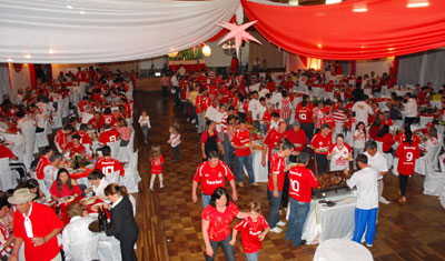 A comitiva do Internacional foi recebida no local do evento com grande alegria pelos colorados. O salão estava impecavelmente decorado de vermelho e branco, as mesas organizadas com oito pessoas em cada, um show de organização do consulado comandado pelo abnegado colorado Jaime Binotto.