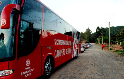 Dirigentes e ex-jogadores colorados com o ônibus 'Campeão de tudo' param o município de Agudo