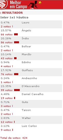 A sócia Maria de Lourdes Thiel, matrícula de número 094849.00, foi a sorteada na promoção "Camisa do melhor jogador colorado em campo" da partida contra o Náutico. Maria de Lourdes concorreu com todos os demais sócios que ingressaram no estádio para assistir ao jogo na partida válida pela 32ª rodada do Brasileirão. Maria de Lourdes receberá a camisa de D'Alessandro, que foi o mais votado na enquete realizada no site. A camisa será entregue no próximo jogo no gramado do Beira-Rio. Veja o resultado da votação: