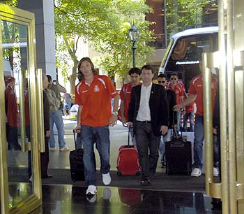 O Inter desembarcou em Buenos Aires com um clima incomum para a capital argentina. Um calor de mais de 30º C aguardou o time colorado na chegada ao Aeroporto de Ezeiza. Em seguida, o grupo rumou para o hotel em Buenos Aires, onde ficará concentrado até a partida para o estádio.