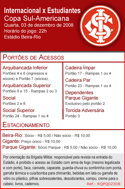 O Inter reitera que não existem mais ingressos para a decisão. Confira abaixo os portões de acesso do Beira-Rio para a grande final: