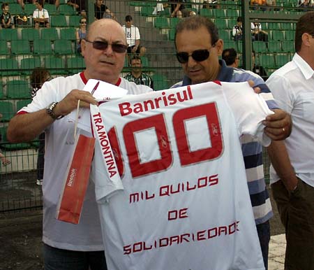 Além do cheque, Gelson Pires também entregou uma camisa com a inscrição '100 mil quilos de solidariedade' a Pedroso, uma alusão à campanha solidária feita pelo Inter. Na semana passada, o Inter já havia repassado à Defesa Civil de Santa Catarina 109 toneladas de doações arrecadadas na campanha '100 anos, 100 mil quilos de solidariedade', que contou com a participação de torcedores, sócios e consulados do Clube.
