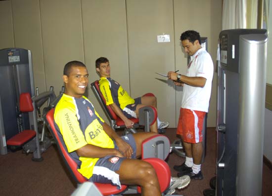 Volante Paulinho (E) e D'Alessandro no início da preparação na Serra
