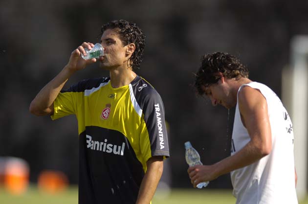 Bolívar (E) e Danny Morais se hidratam durante o treino