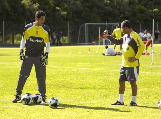 Lauro ouve a orientação do preparador de goleiros Jorge Luiz