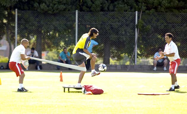 Antes dos trabalhos com bola, porém, o grupo foi submetido a exercícios puxados pelo preparador físico Fábio Mahseredjan. Ao seu comando, os atletas tinham que dar piques curtos, giros, cambalhotas e flexões. Apesar do esforço grande, o grupo demonstrou bastante descontração e brincou com Mahseredjan, como se ele fosse um sargento e os jogadores, os soldados. Enquanto isso, a torcida presente se divertia com o clima descontraído dos atletas.