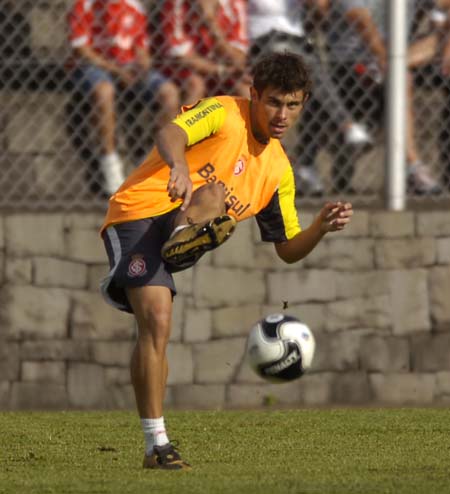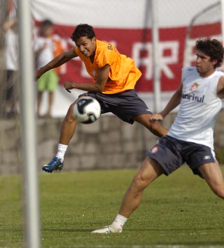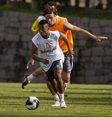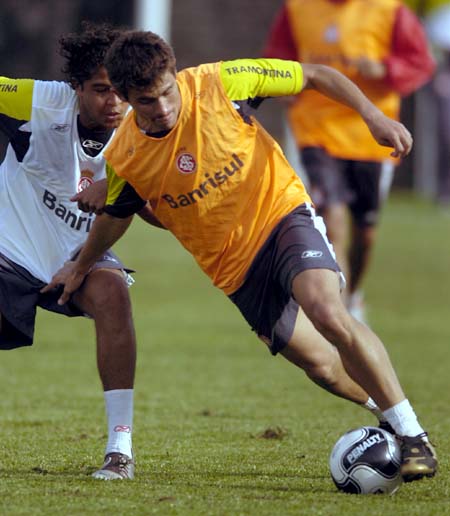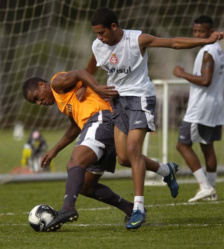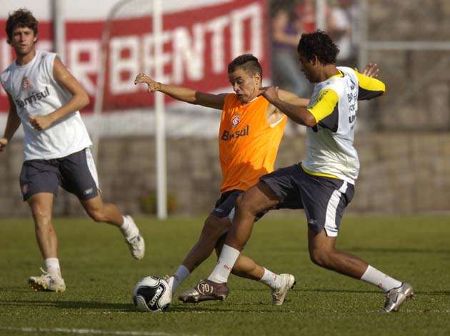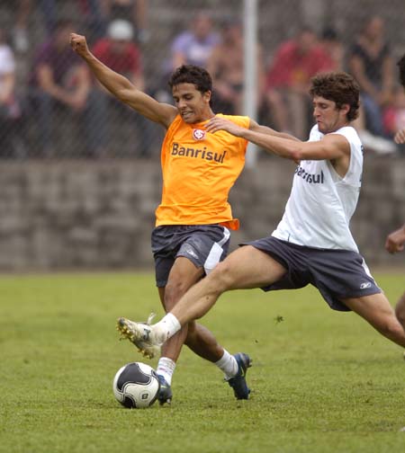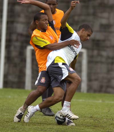 Taison (D) tenta a jogada sobre o volante Paulinho