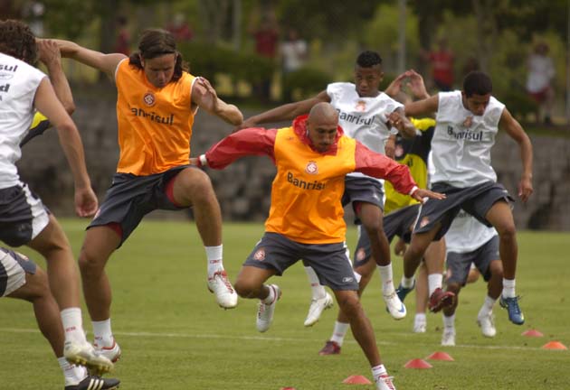 Jogadores durante o aquecimento no quarto dia da pré-temporada