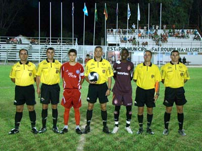 Goleiro Wellington (D) e o capitão do Apefi posam para foto junto à arbitragem no Efipam