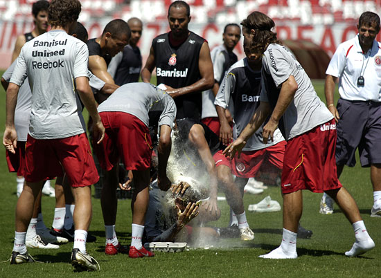 Volante Maycon no chão era um dos aniveriantes do sábado e levou ovada com farinha numa grande festa feita pelos companheiros - Índio e Muriel escaparam da meleca no corpo ao irem antes pro vestiário
