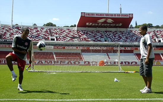 No treino da manhã deste sábado, Taison (E) teve seu irmão como espectador ilustre, que no final até bateu uma bolinha com o irmão famoso e bom de bola