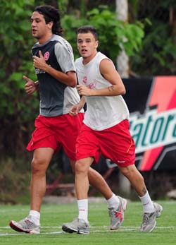 O meia-atacante D?Alessandro (à direita na foto), que ficou de fora da partida no Bento Freitas, correu em volta do gramado. O exame ao qual o argentino foi submetido não apontou lesão muscular, e ele poderá treinar normalmente na atividade programada para a tarde desta quinta. O zagueiro Álvaro, que sentiu uma lesão durante o jogo em Pelotas, será reavaliado pelo departamento médico nesta quinta.