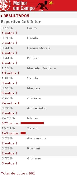 Autor de três gols na vitória de 6 a 2 sobre o Esportivo, Nilmar venceu disparado a enquete do 'Melhor Jogador em Campo', em Bento Gonçalves. Taison, que também marcou três vezes, ficou em segundo. Veja os números da votação: