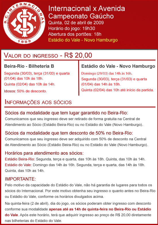 Por causa da capacidade do Estádio do Vale, não há espaço suficiente para todos nossos sócios, sendo assim, é necessário retirar ingresso para poder acessar o estádio no jogo Internacional x Avenida. Desta forma, convidamos a todos para que exerçam sua preferência como sócio.
