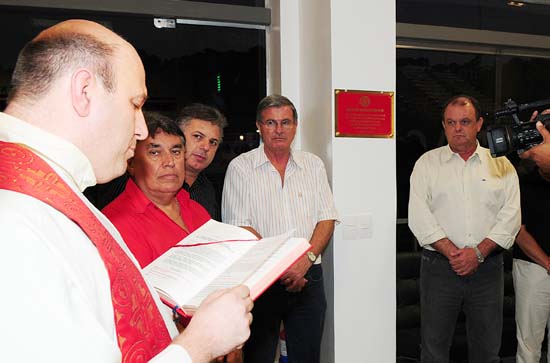 Padre Leandro (E) abençoa o novo setor obervado por Emídio Ferreira (vice de Patrimônio), Pedro Affatao (1º vice-presidente), Décio Hartmann (vice de Administração) e Vitorio Piffero