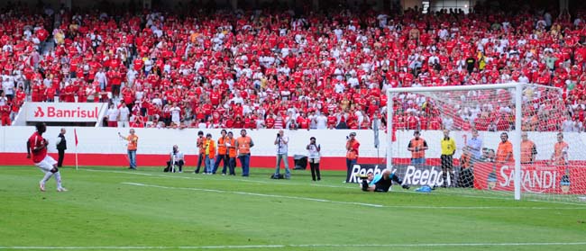 A pressão colorada era grande. O gol iminente. Aos 31min, Índio lançou para Nilmar, que entrou na área e foi derrubado por Thiego. Pênalti para o Inter! Andrezinho cobrou no cantinho e deixou tudo igual no clássico: 1 a 1.