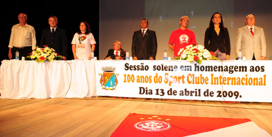Os vice-presidentes do Clube Gelson Pires e Roberto Siegmann receberam das mãos dos filhos dos vereadores de São Leopoldo uma placa comemorativa ao Centenário do Internacional. Siegmann listou os tantos títulos do Inter, tantos que tornaram o Clube campeão de tudo, e comentou sobre a história única e gloriosa do Sport Club Internacional. "Para ser grande é preciso nascer com o espírito de grandeza. Assim que o Internacional cresceu, sendo o primeiro clube do Estado a ter jogadores negros, sempre preocupado com a inclusão social e com toda as necessidades de toda a comunidade, sendo o clube de todos, o Clube do Povo do Rio Grande do Sul", concluiu Roberto Siegmann.