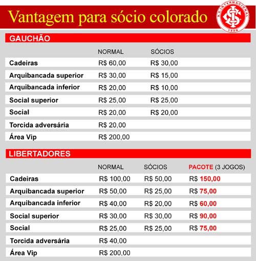 O Internacional está lançando uma promoção para lá de especial para os sócios. Comprando os ingressos para os três jogos do Inter na primeira fase da Libertadores da América no Beira-Rio, o associado ganhará de brinde as entradas para os três primeiros jogos do Campeonato Gaúcho no estádio colorado.