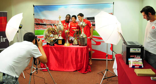 A sessão de autógrafos e fotos com os jogadores do Inter agitou a noite desta sexta-feira, em Bento Gonçalves. O evento realizado no Hotel Dall'Onder contou com a presença das taças das maiores conquistas do Inter, como do Mundial de Clubes Fifa, Libertadores e Sul-Americana, bem como o novo mascote dos projetos sociais do Inter, o Escurinho. As fotos, reveladas na hora, custavam R$ 30,00 mais dois quilos de alimentos não-perecíveis, com direito a um cartão personalizado dos atletas. Andrezinho, Edu, Giuliano e Lauro fizeram a alegria dos jovens colorados.