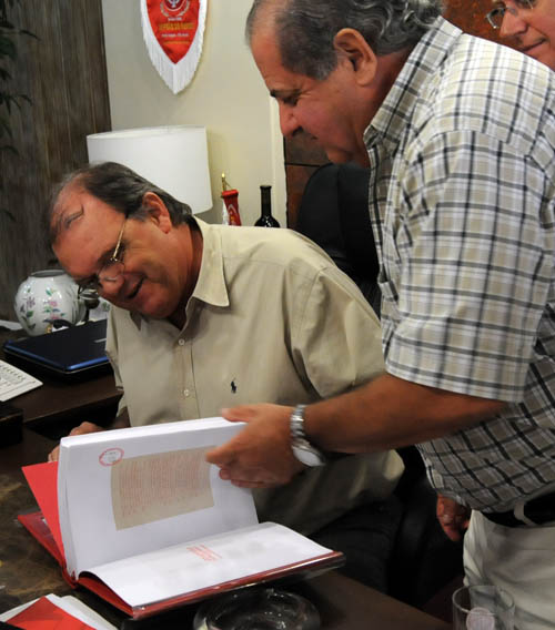 Vitorio Piffero oberva Persio Brinckmann folhar o livro que traz a história jurídica do Inter